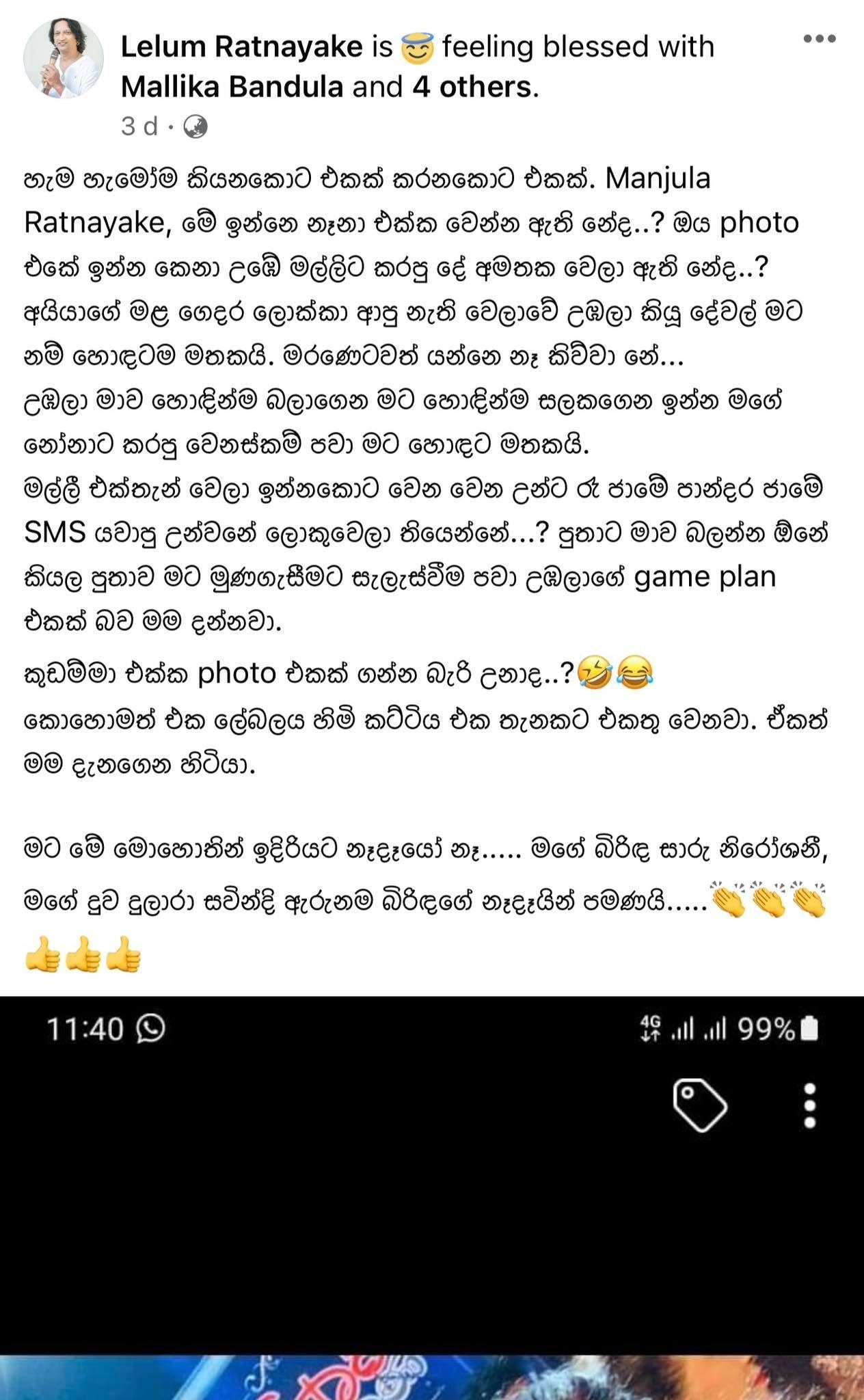 මල්ලී එක්තැන් වෙලා ඉන්නකොට වෙන වෙන උන්ට රෑ ජාමේ පාන්දර ජාමේ SMS යවාපු උන්වනේ ලොකුවෙලා තියෙන්නේ…? පුතාට මාව බලන්න ඕනේ කියල පුතාව මට මුණගැසීමට සැලැස්වීම පවා උඹලාගේ game plan එකක් බව මම දන්නවා.