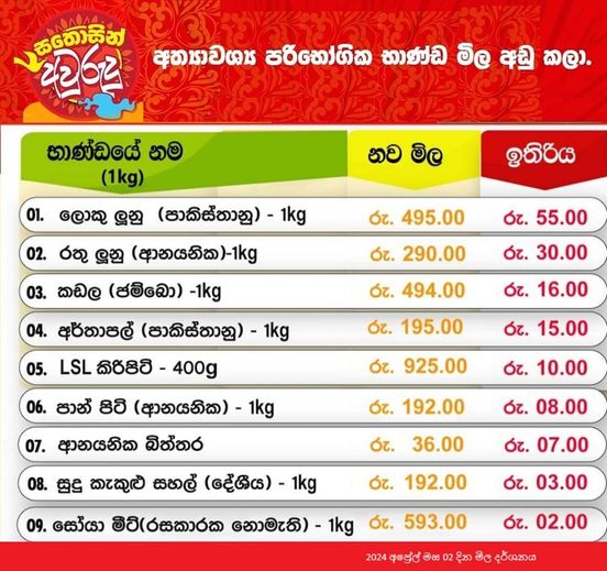 මධ්යම රාත්රියේ සිට ක්රියාත්මක වන පරිදි ලංකා සතොස අලෙවිසැල්වල ආනයනික බිත්තරයක මිල පහළ දමා තිබෙනවා. බිත්තර පමණක් නෙමේ අත්යවශ්ය භාණ්ඩ 9ක මිල සිංහල දෙමල අලුත් අවුරුද්දට අඩු මිලට ලබා දීමට ලංකා සතොස පියවර අරගන තියෙනවා.