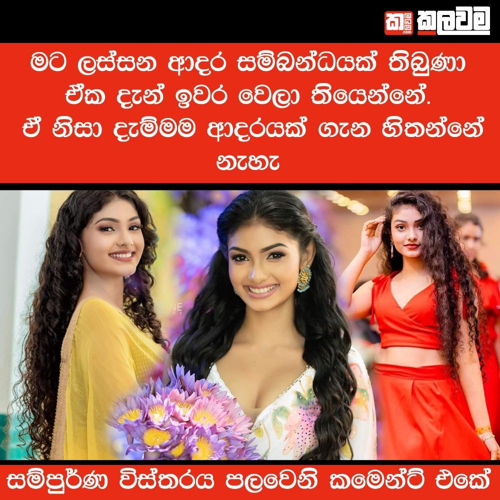 “මට පෙම්වතෙක් නැහැ.ආදර යෝජනා එන්නේ නෑ ආවත් මම හිතන්නෙ නෑ ඒවා පිළිගනියි කියලා. මට ලස්සන ආදර සම්බන්ධයක් තිබුණා ඒක දැන් ඉවර වෙලා තියෙන්නේ. ඒ නිසා දැම්මම ආදරයක් ගැන හිතන්නේ නැහැ”