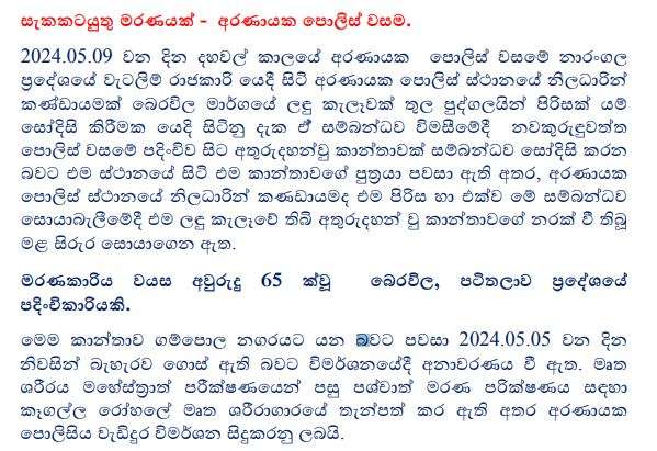 පොලීසිය සඳහන් කළේ 65 හැවිරිදි කාන්තාවකගේ සිරුරක් එලෙස හමුවී ඇති අතර ඇය බෙරවිල පටිතලාව ප්රදේශයේ පදිංචිකාරියක් බවය.