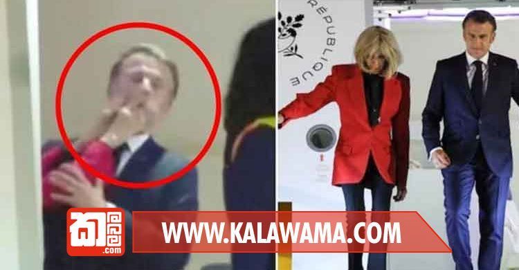 යානයේ දොර විවර වෙද්දී කාන්තා අතක් තරවටු ස්වරූපයෙන් මැක්රොන්ගේ මුහුණ අල්ලා තල්ලු කරන බවක් පැහැදිලිව පෙනෙයි.