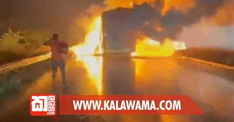බස් රථය සම්පූර්ණයෙන්ම ගිනිගෙන තිබේ.