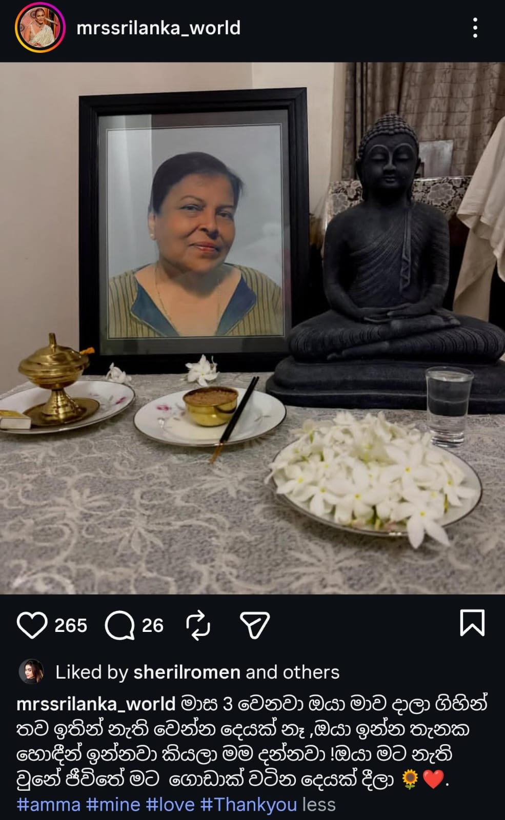 “මාස 3 වෙනවා ඔයා මාව දාලා ගිහින් තව ඉතින් නැති වෙන්න දෙයක් නෑ, ඔයා ඉන්න තැනක හොඳීන් ඉන්නවා කියලා මම දන්නවා !ඔයා මට නැති වුනේ ජීවිතේ මට ගොඩාක් වටින දෙයක් දීලා..”