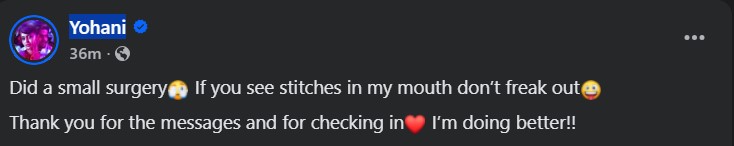 තමාට හදිසියේම කුඩා ශල්යකර්මයකට (Small Surgery) මුහුණ දීමට සිදුවූ බවත්, ඒ හේතුවෙන් ඇගේ මුවෙහි මැහුම් (Stitches) යොදා ඇති බවත් යොහානි පවසා සිටිනවා.